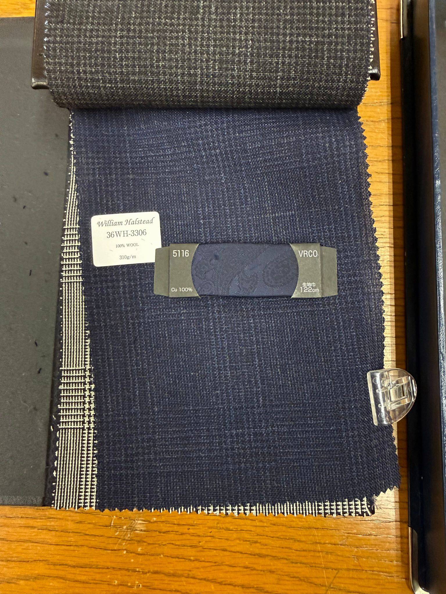 A high-twist fabric in a navy glen check from William Halstead. On top an example of a navy lining with a paisley design. Do you want a suit? Do you want a sports jacket? Answering these questions help you choose a great fabric.